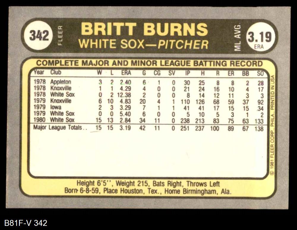 1981 Fleer #342 xHAND Britt Burns
