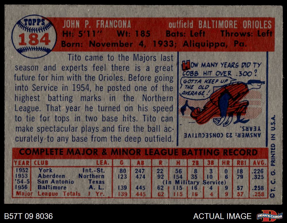 1957 Topps #184 Tito Francona 4 - VG/EX