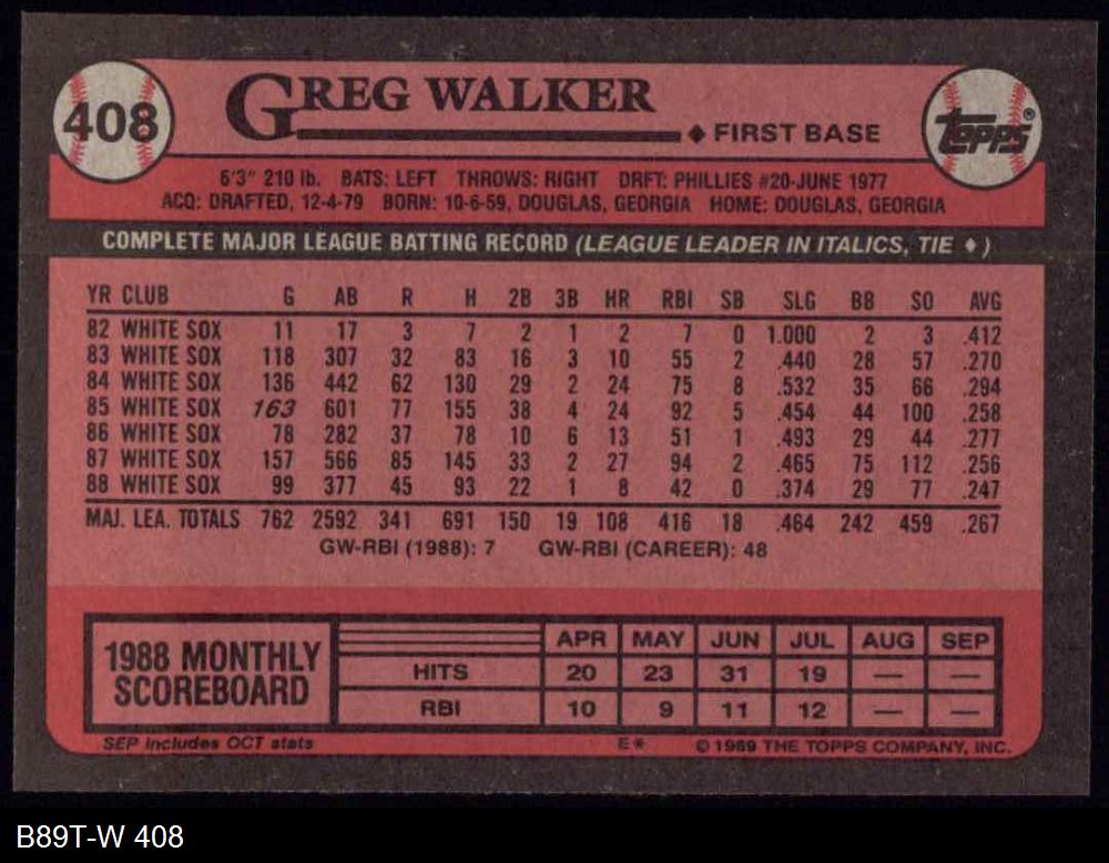 1989 Topps #408 Greg Walker 8 - NM/MT