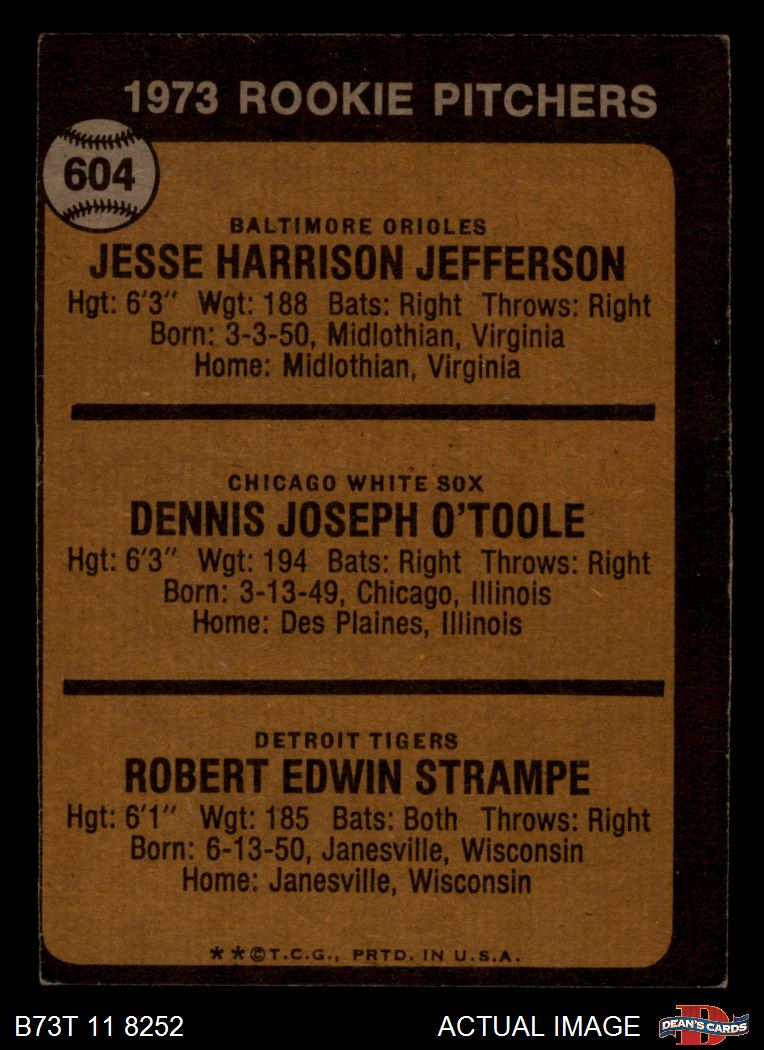 1973 Topps #604 - Jesse Jefferson / Dennis O'Toole / Bob Strampe Rookie Pitchers 3 - VG