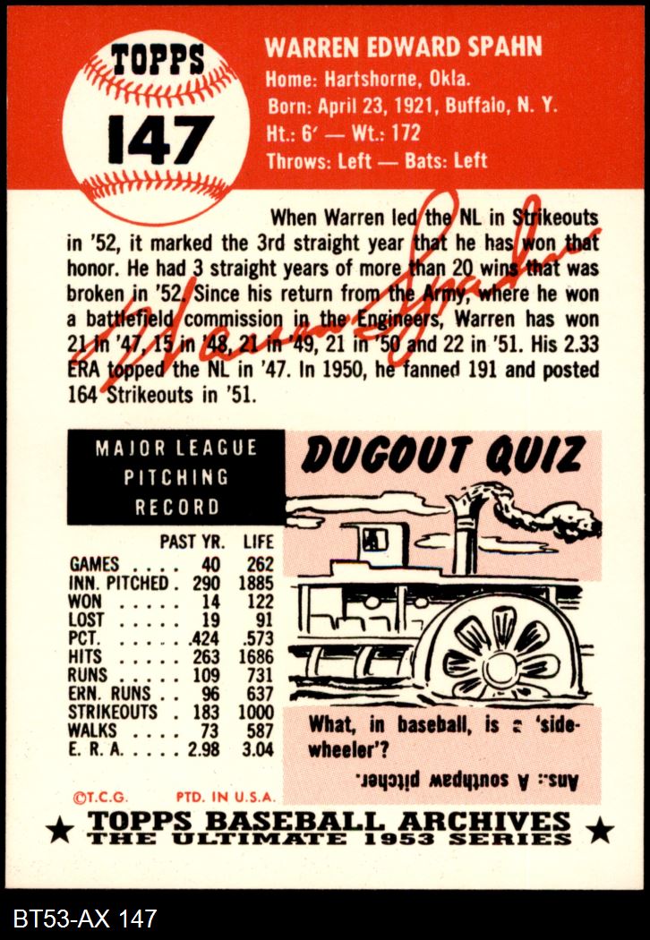 1953 Topps Archives #147 Warren Spahn