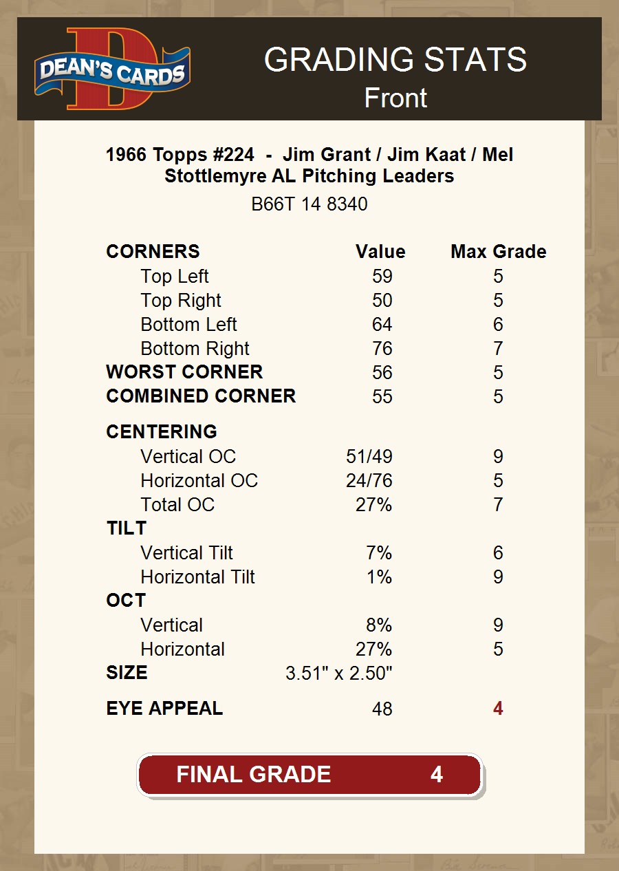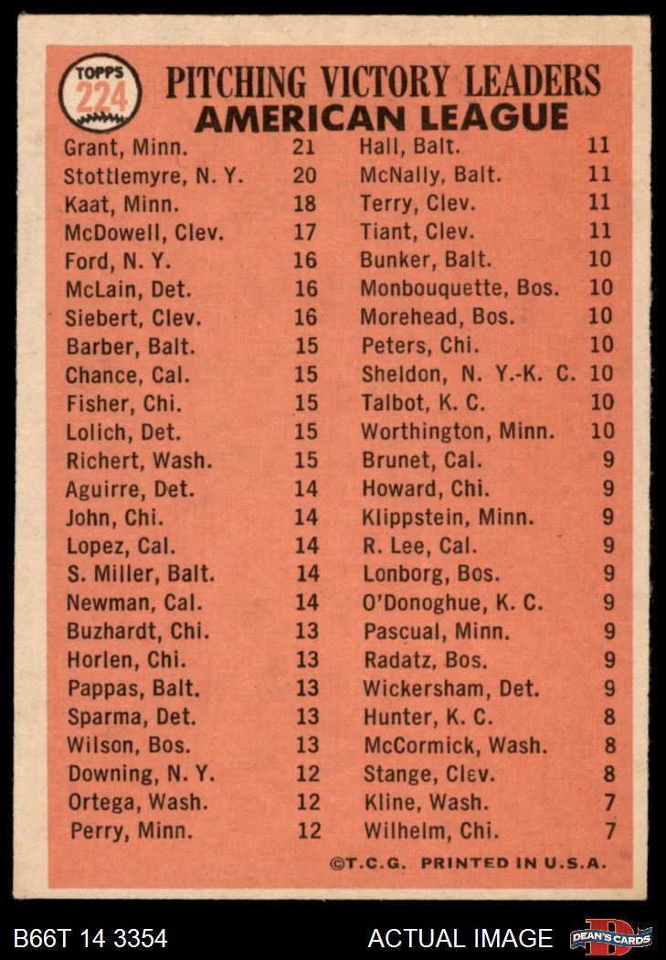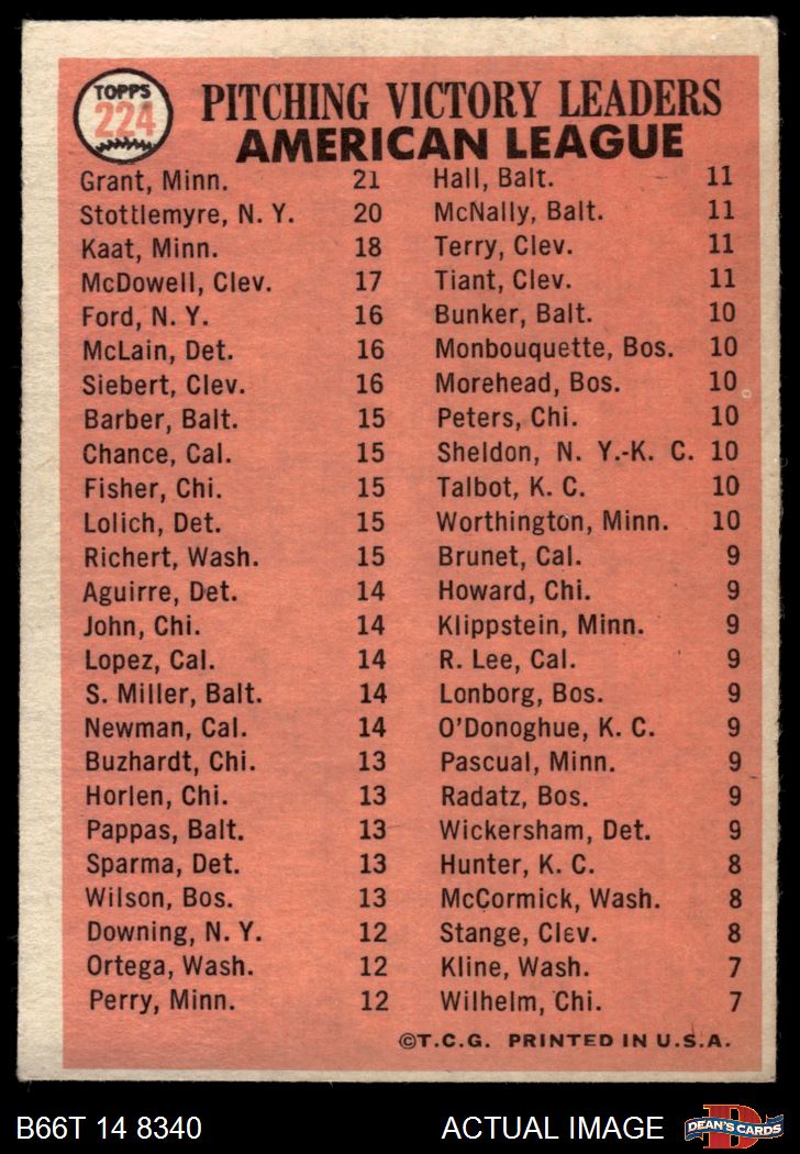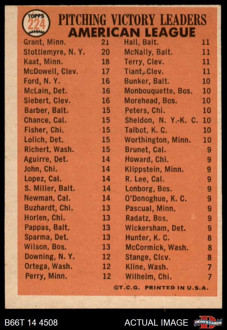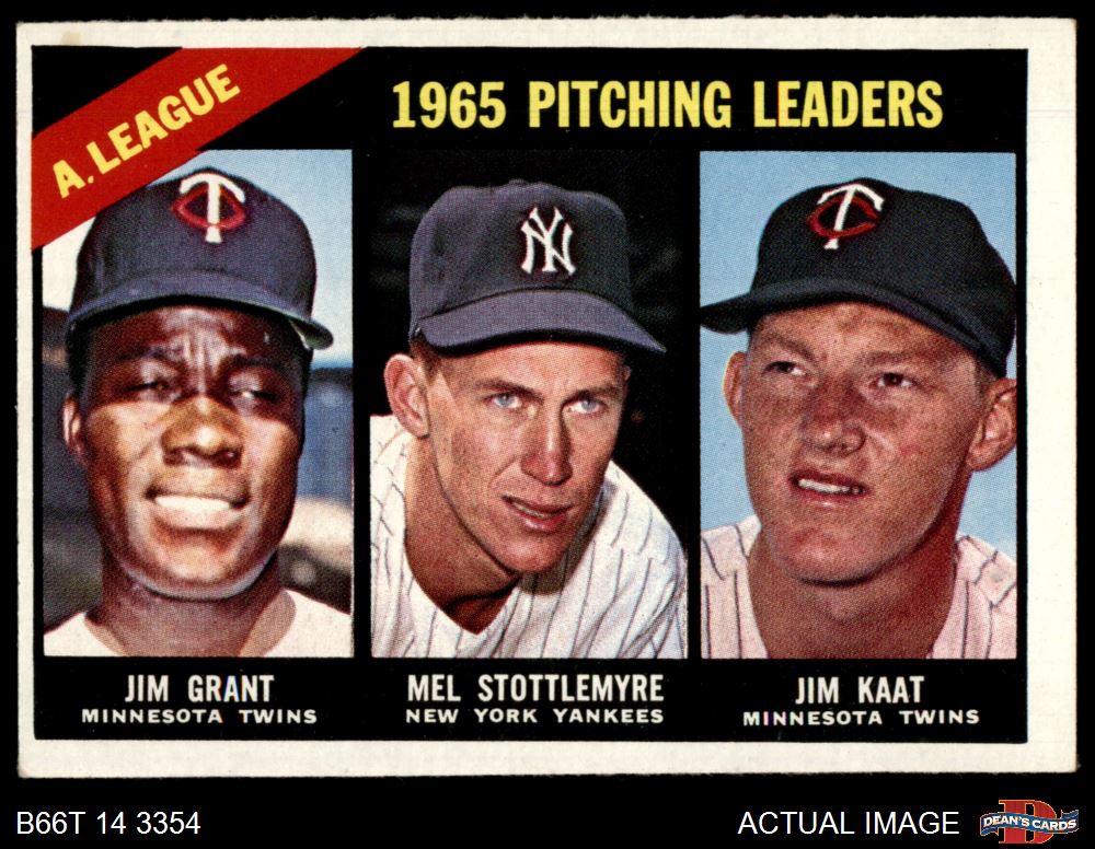 1966 Topps #224 - Jim Grant / Jim Kaat / Mel Stottlemyre AL Pitching Leaders 4 - VG/EX
