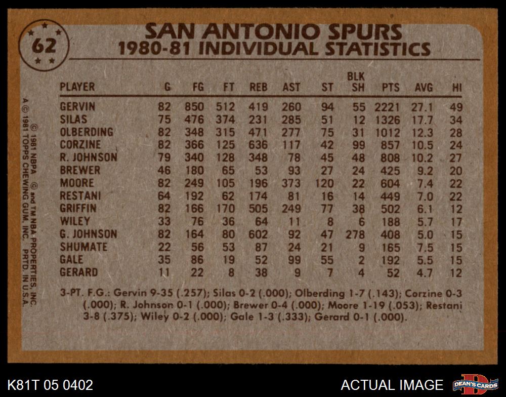 1981 Topps #62 - George Gervin / Dave Corzine / Johnny Moore Spurs Leaders 5 - EX