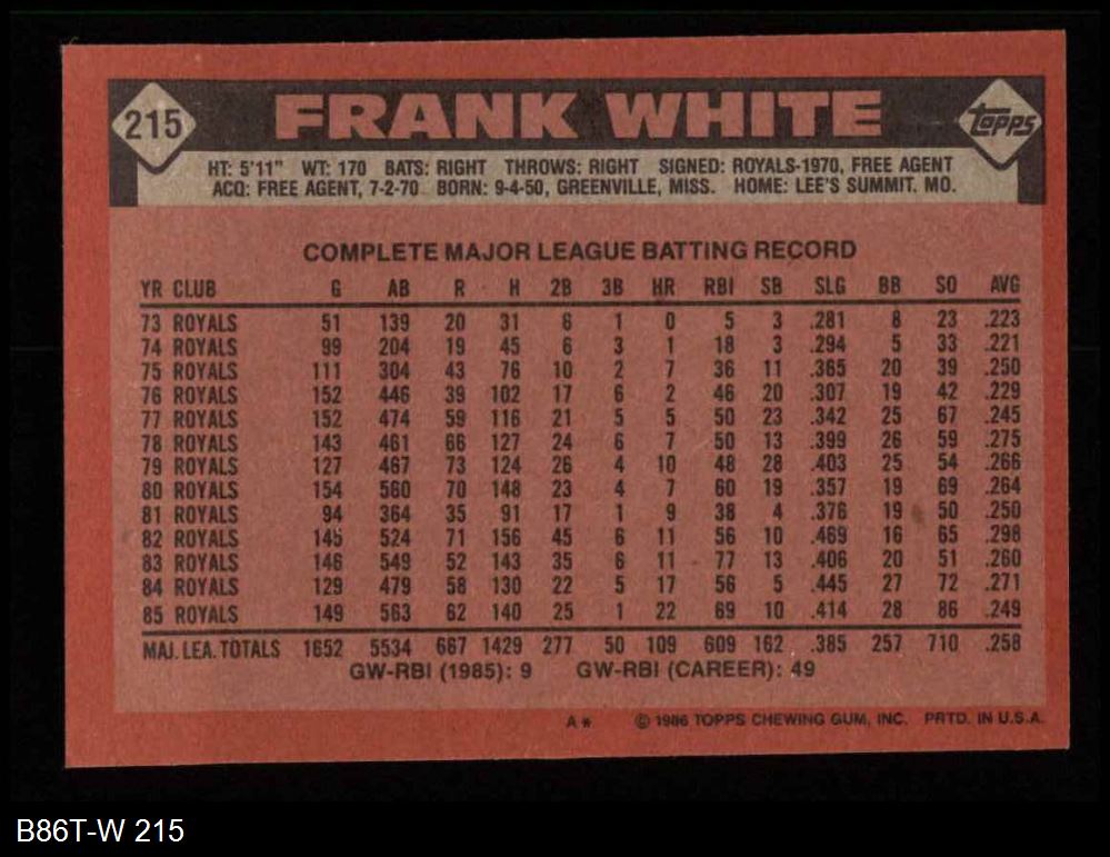 1986 Topps #215 Frank White 8 - NM/MT