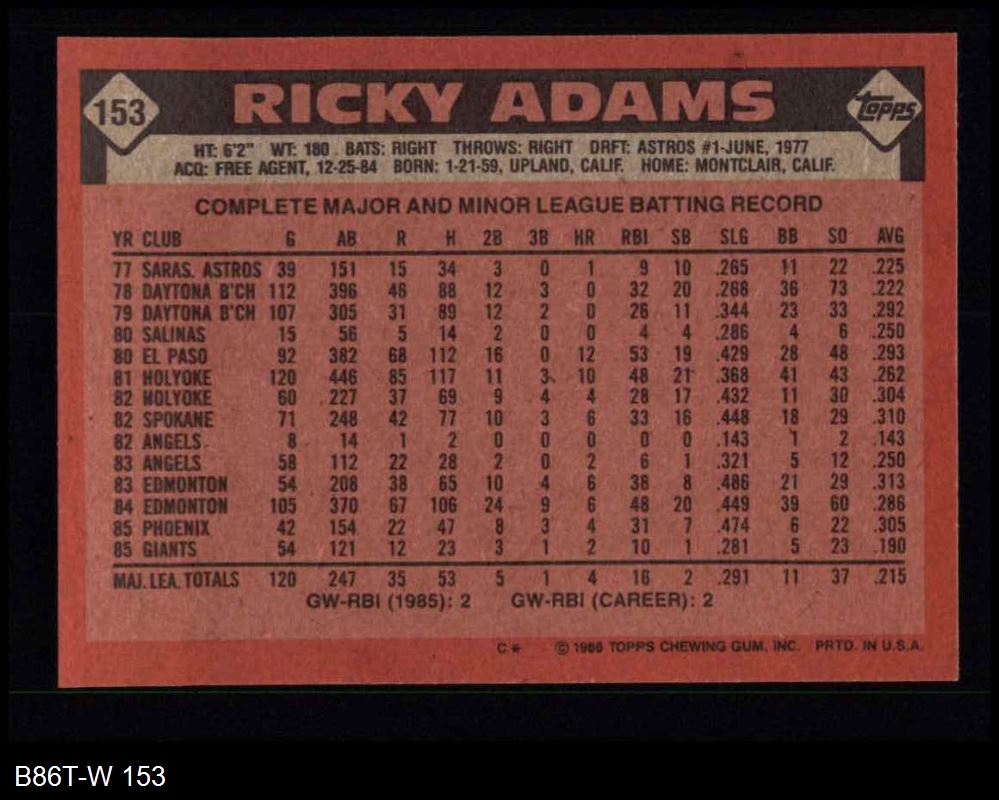1986 Topps #153 Ricky Adams 8 - NM/MT