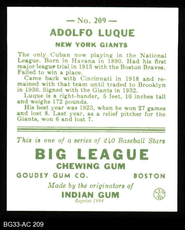 1933 Goudey Reprint #209 Dolf Luque 8 - NM/MT