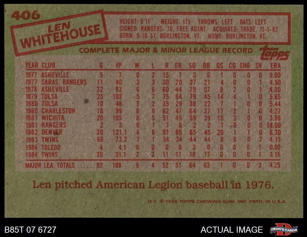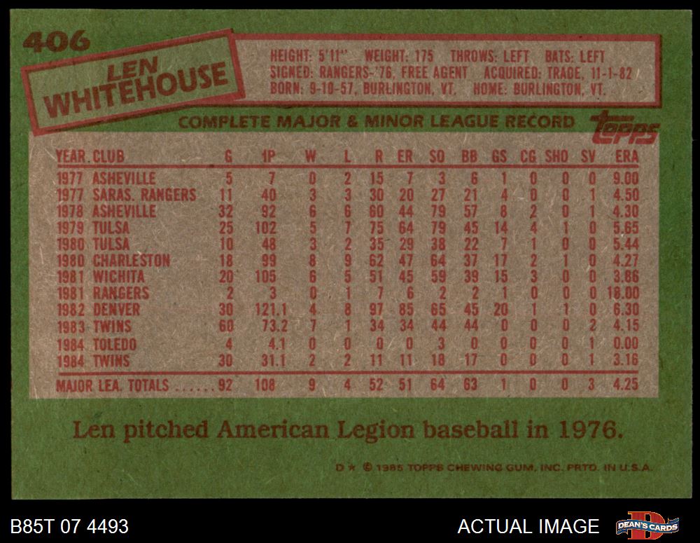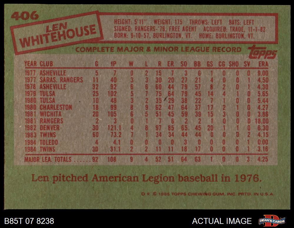 1985 Topps #406 Len Whitehouse 8 - NM/MT