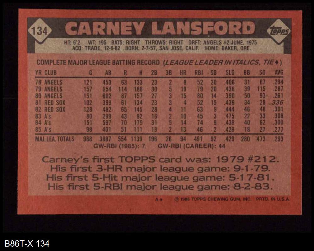 1986 Topps #134 Carney Lansford 8 - NM/MT