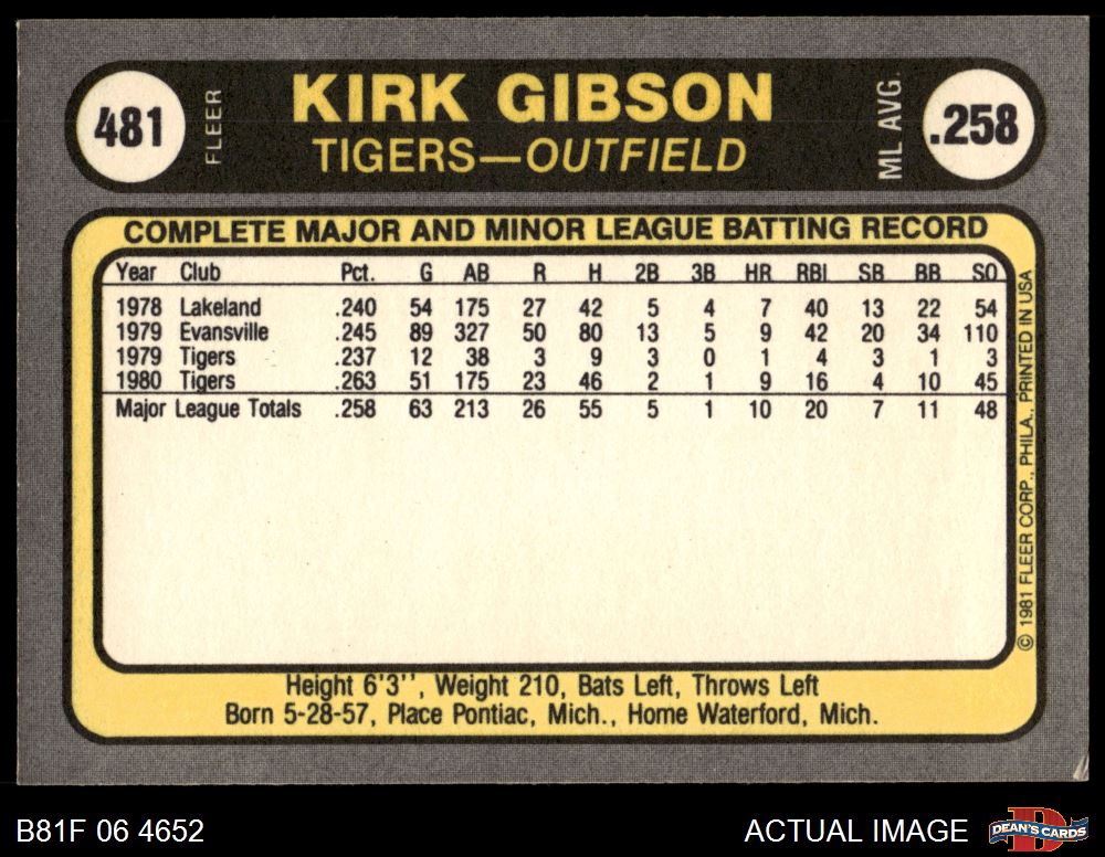1981 Fleer #481 Kirk Gibson 8 - NM/MT