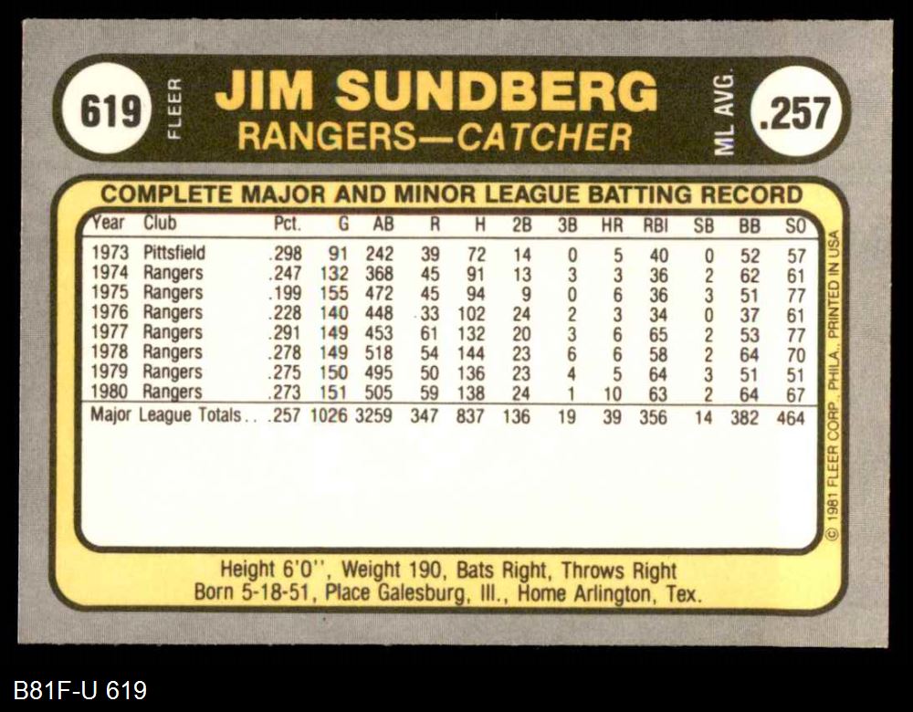 1981 Fleer #619 Jim Sundberg 8 - NM/MT