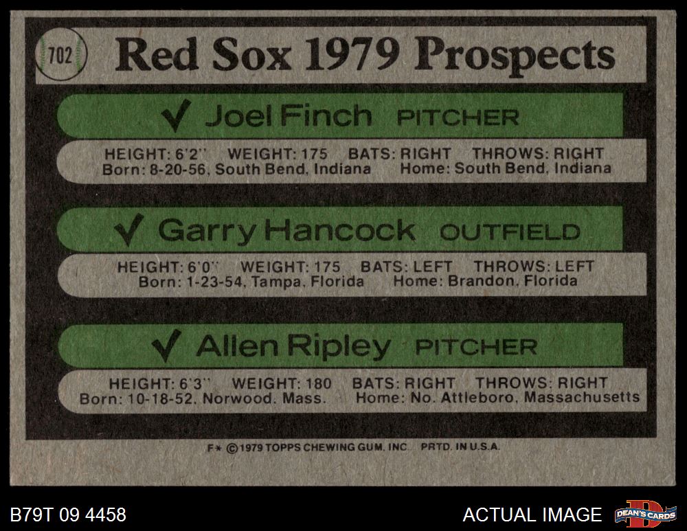 1979 Topps #702 - Joel Finch / Garry Hancock / Allen Ripley Red Sox Prospects 4 - VG/EX