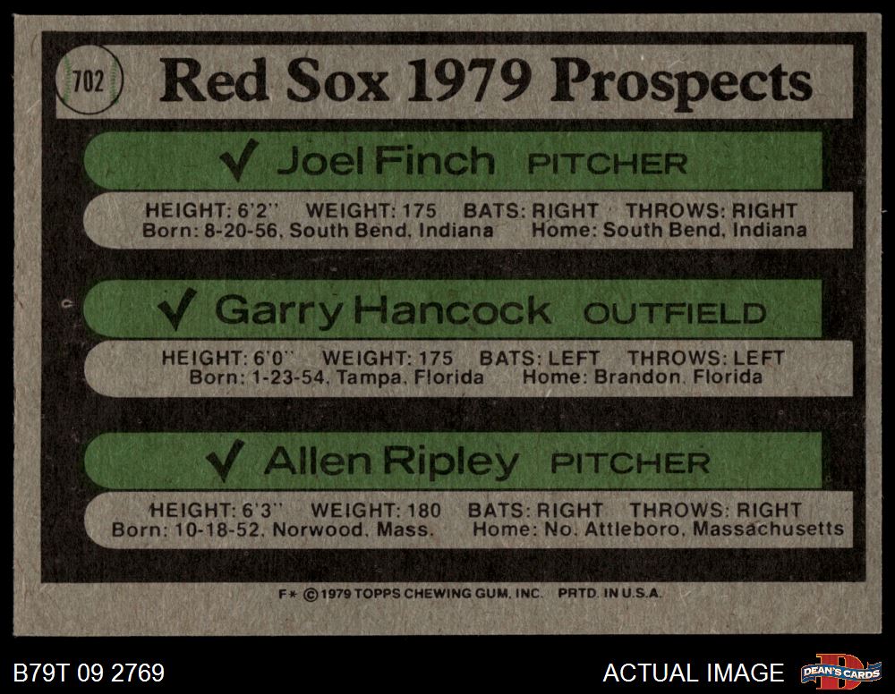 1979 Topps #702 - Joel Finch / Garry Hancock / Allen Ripley Red Sox Prospects 6 - EX/MT