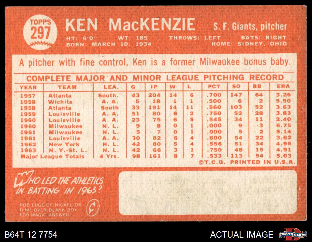 1964 Topps #297 Ken MacKenzie