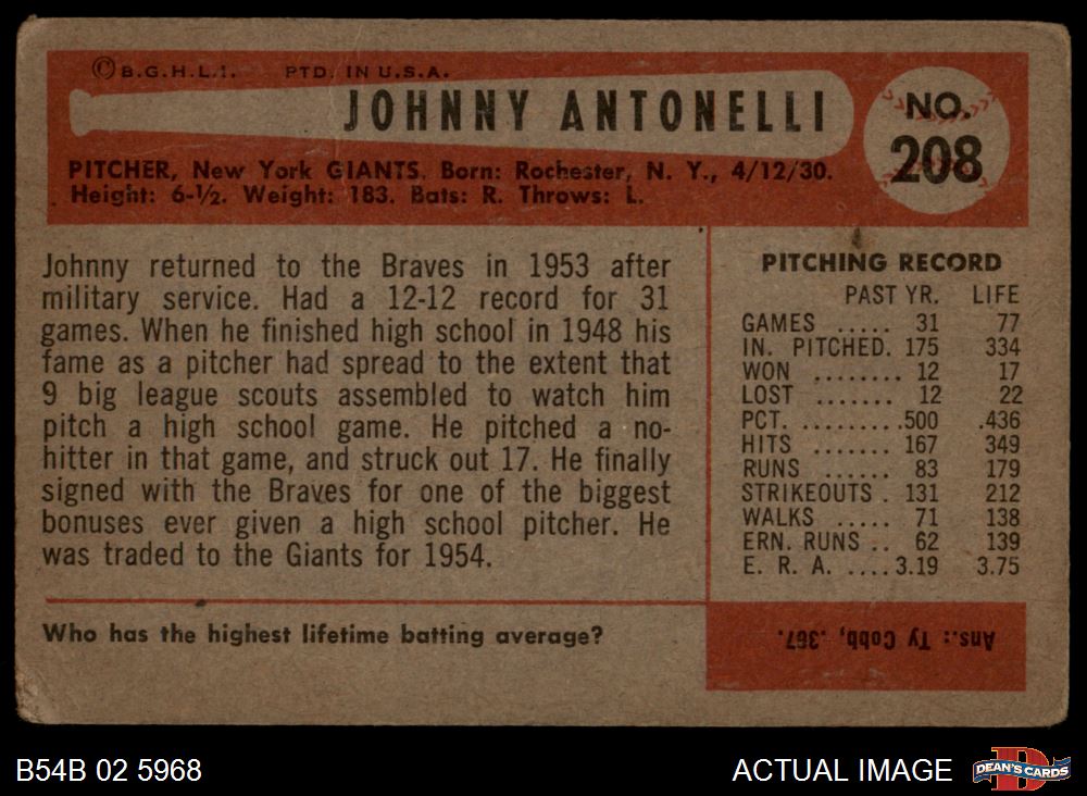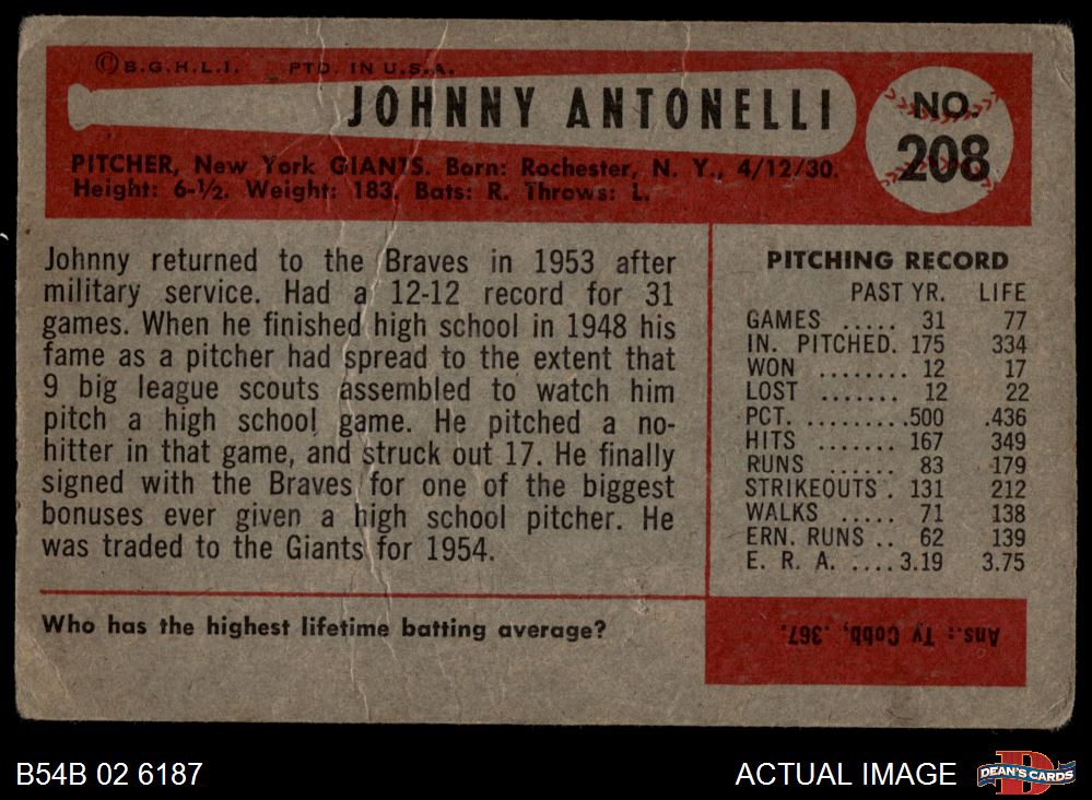 1954 Bowman #208 Johnny Antonelli