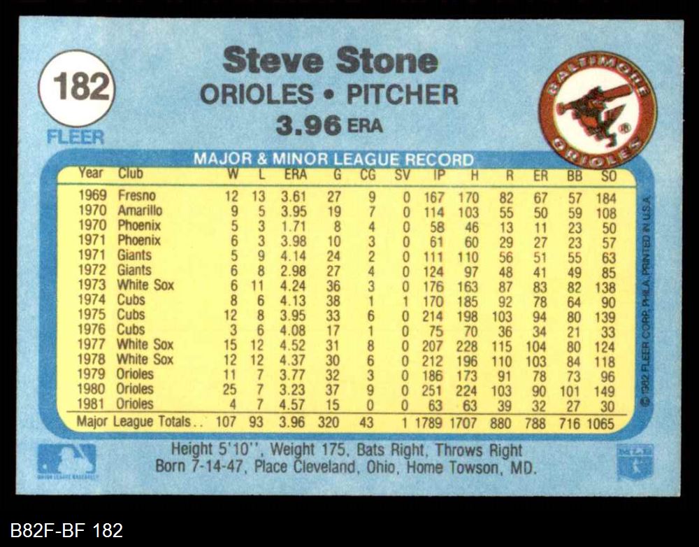 1982 Fleer #182 Steve Stone 8 - NM/MT