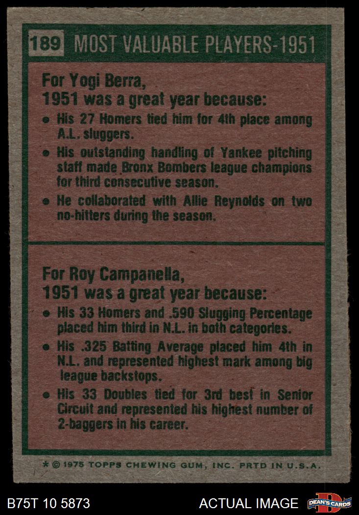1975 Topps #189 - Yogi Berra / Roy Campanella 1951 MVPs 4 - VG/EX