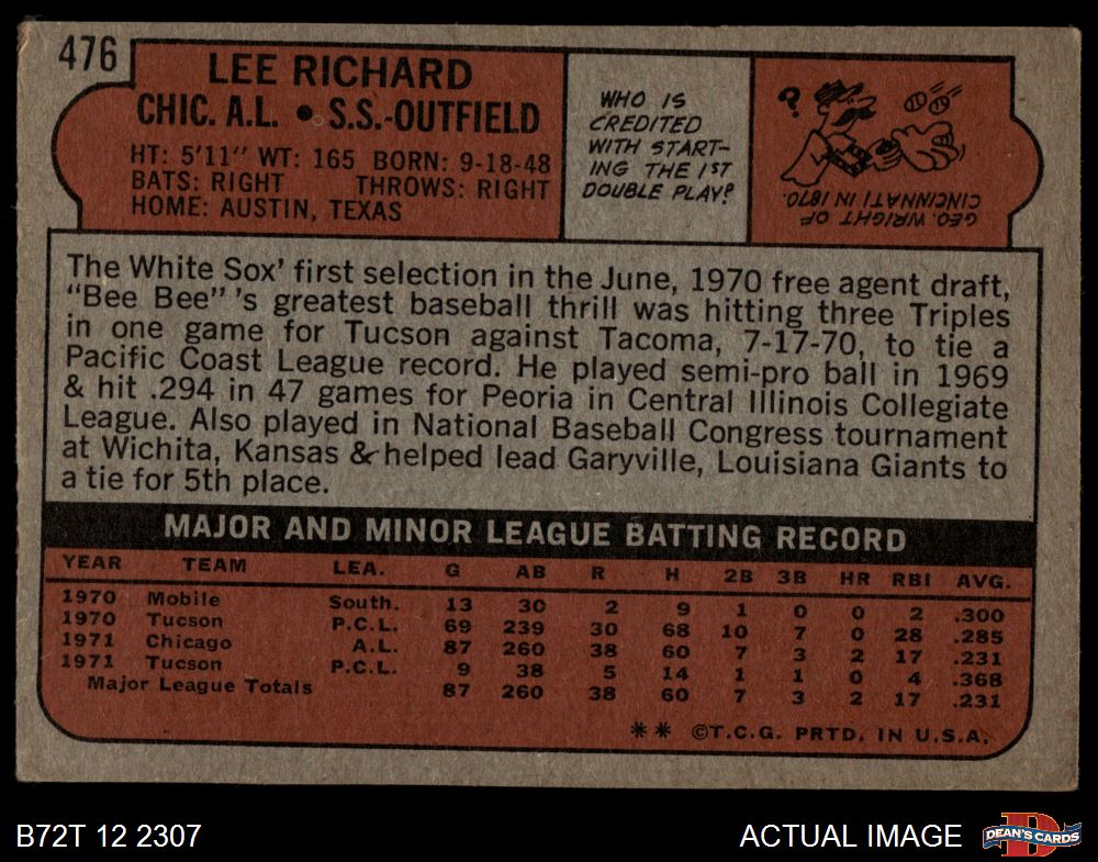 1972 Topps #476 Lee Richard 2 - GOOD
