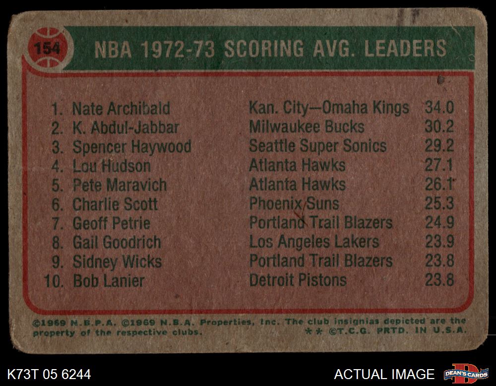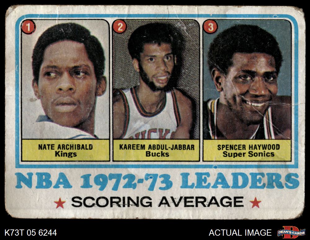 1973 Topps #154 - Nate Archibald / Kareem Abdul-Jabbar / Spencer Haywood NBA Scoring Average Leaders AUTHENTIC