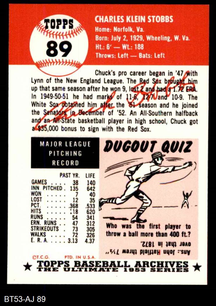 1953 Topps Archives #89 Chuck Stobbs 8 - NM/MT