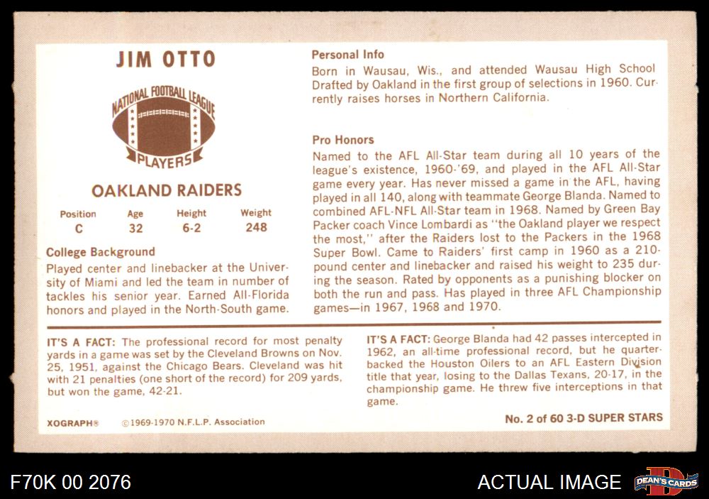 1970 Kellogg's #2 Jim Otto 7 - NM