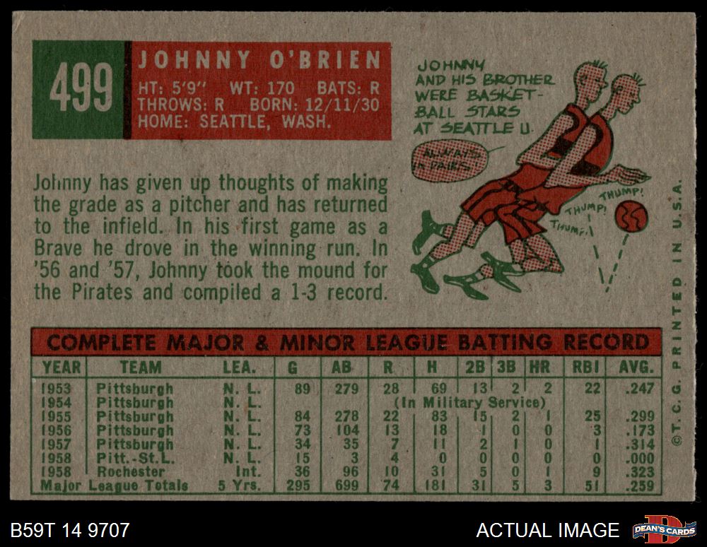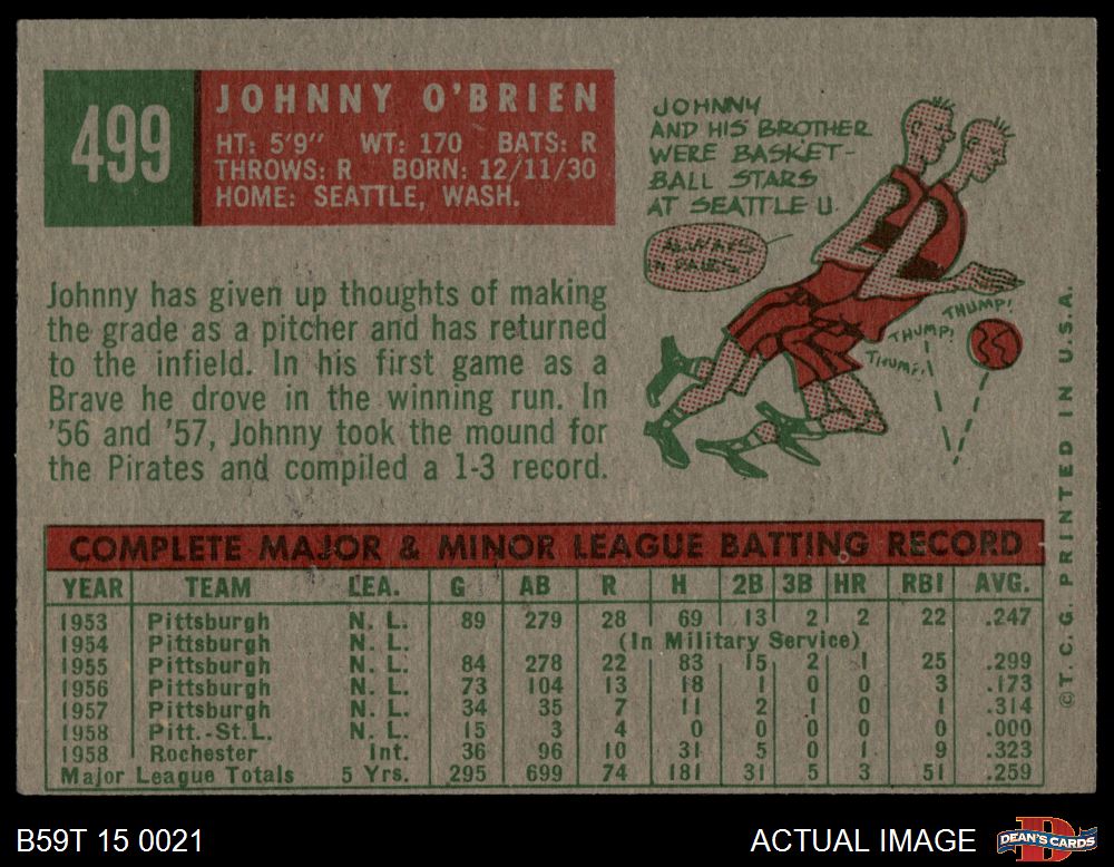 1959 Topps #499 Johnny O'Brien 4.5 - VG/EX+