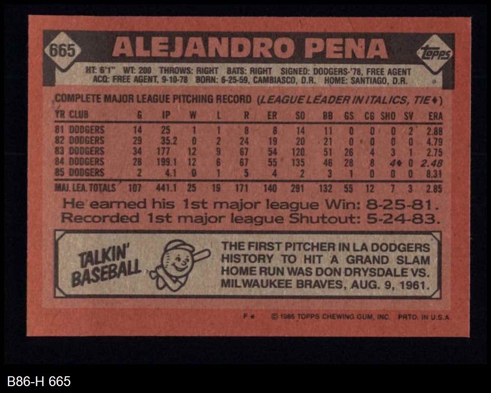 1986 Topps #665 Alejandro Pena