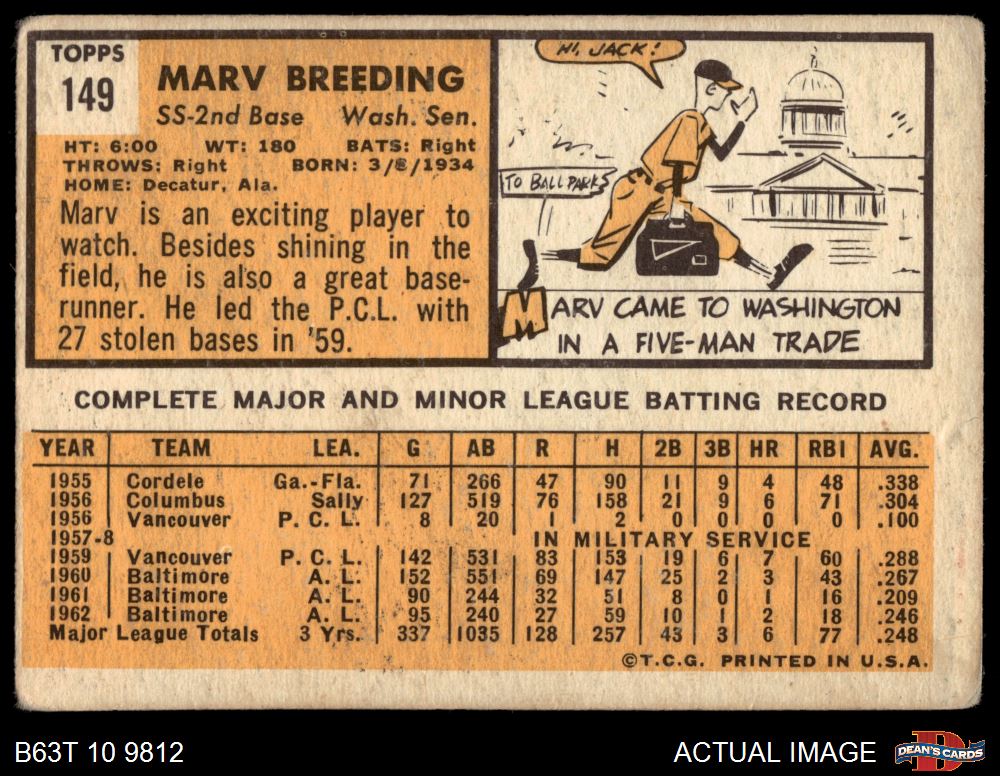 1963 Topps #149 Marv Breeding 1 - POOR