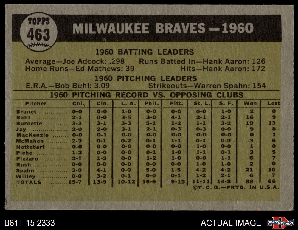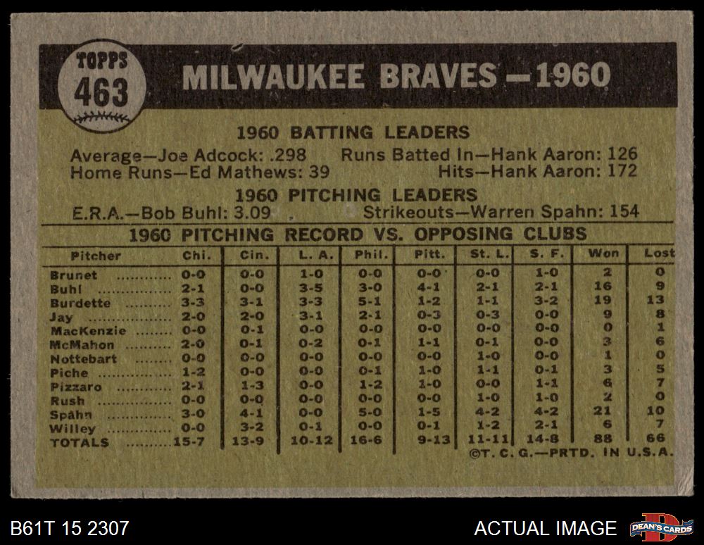 1961 Topps #463 MIL Braves Team 4 - VG/EX