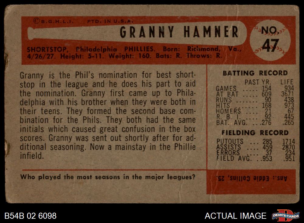 1954 Bowman #47 2B Granny Hamner 1 - POOR