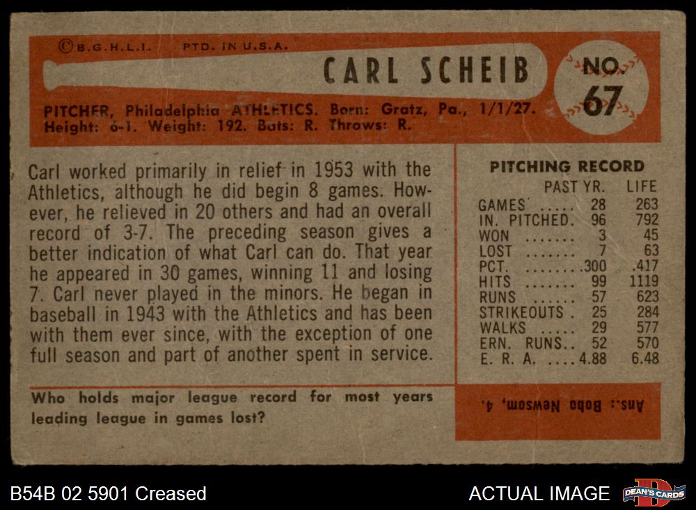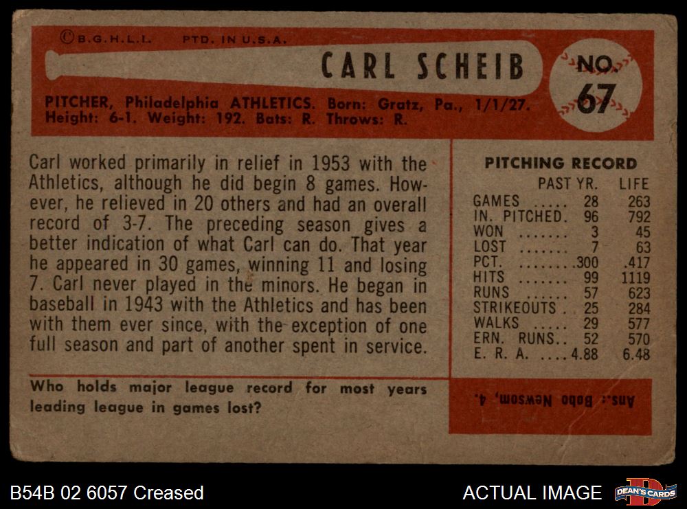 1954 Bowman #67 COR Carl Scheib 2 - GOOD
