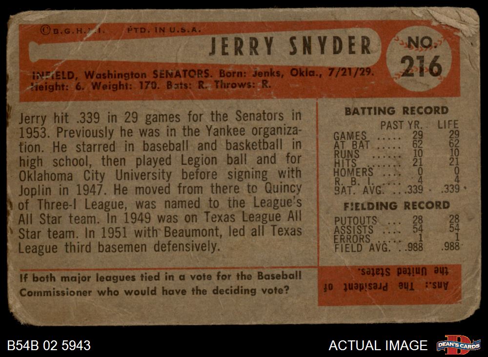 1954 Bowman #216 ALL Jerry Snyder AUTHENTIC