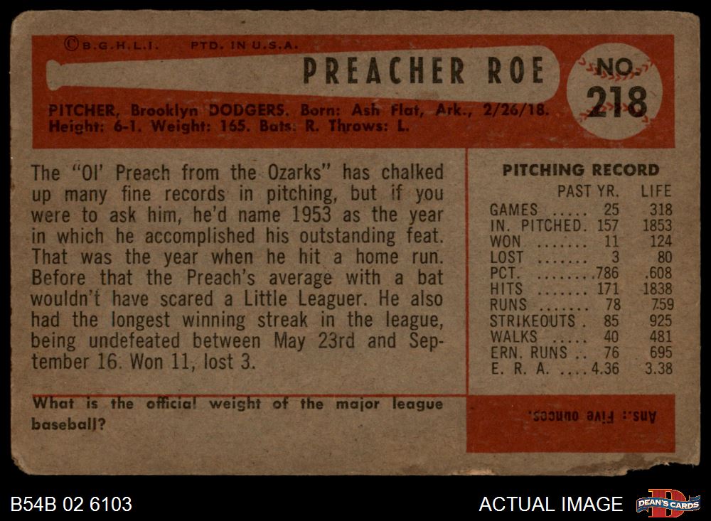 1954 Bowman #218 Preacher Roe AUTHENTIC