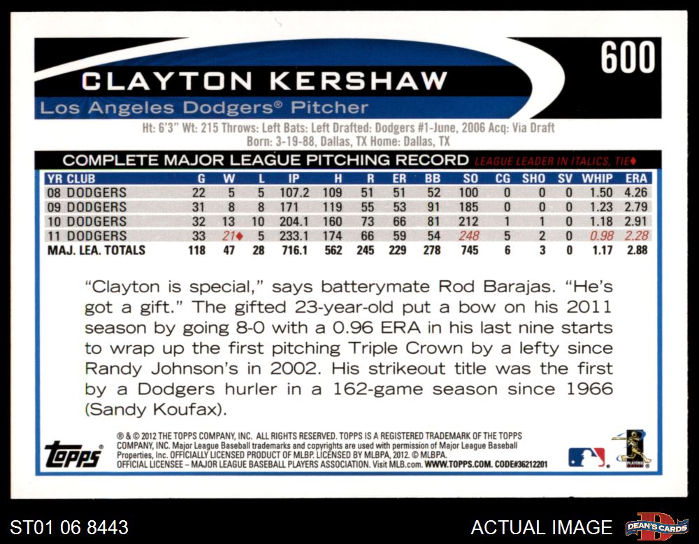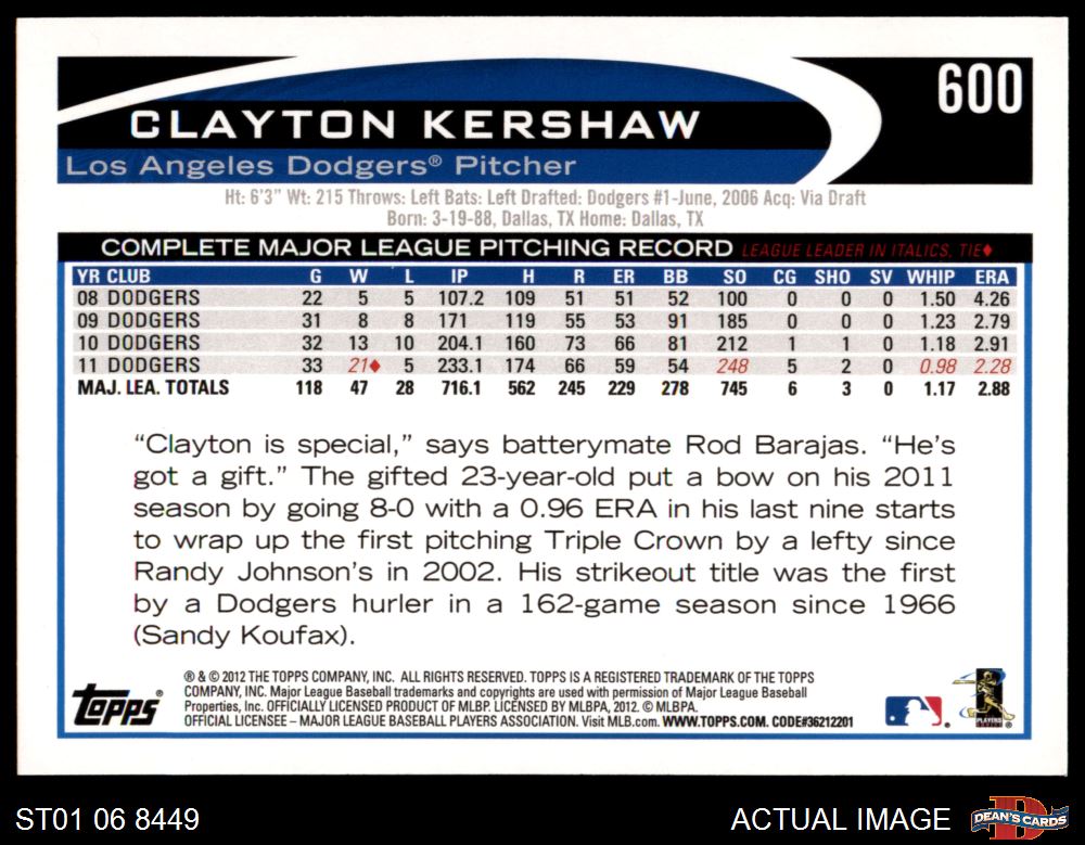 2012 Topps #600 Clayton Kershaw 8 - NM/MT