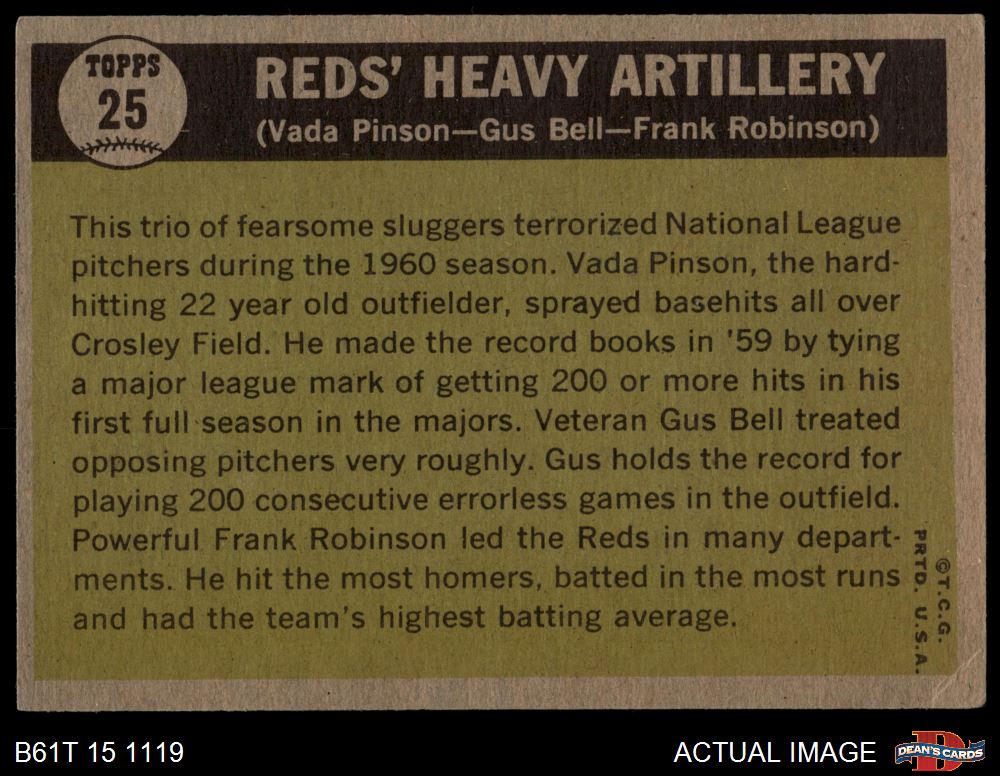 1961 Topps #25 - Frank Robinson / Vada Pinson / Gus Bell Reds Heavy Artillery 4.5 - VG/EX+