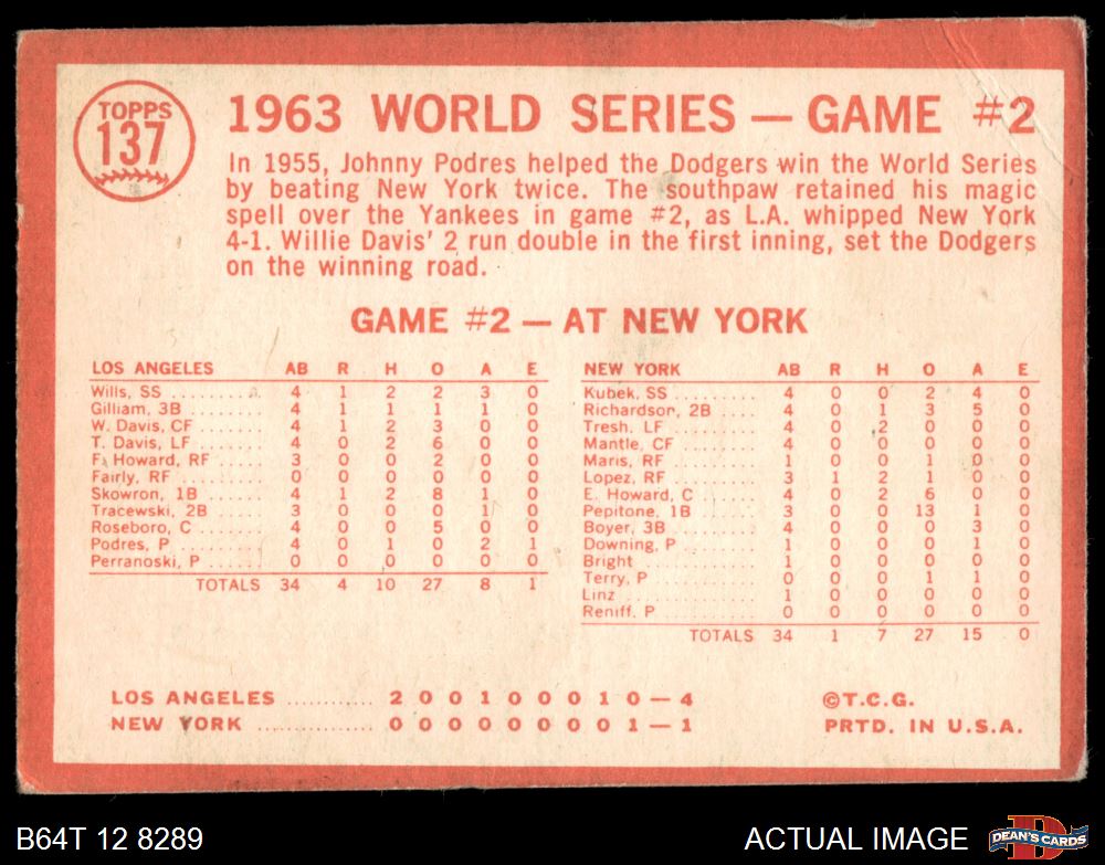 1964 Topps #137 1963 World Series - Game #2 - Davis Sparks Rally - Willie Davis 2 - GOOD