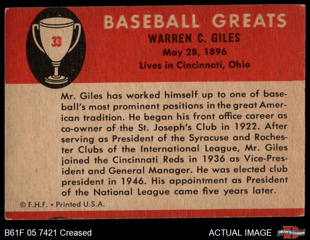 1961 Fleer #33 Warren Giles Front Thumbnail