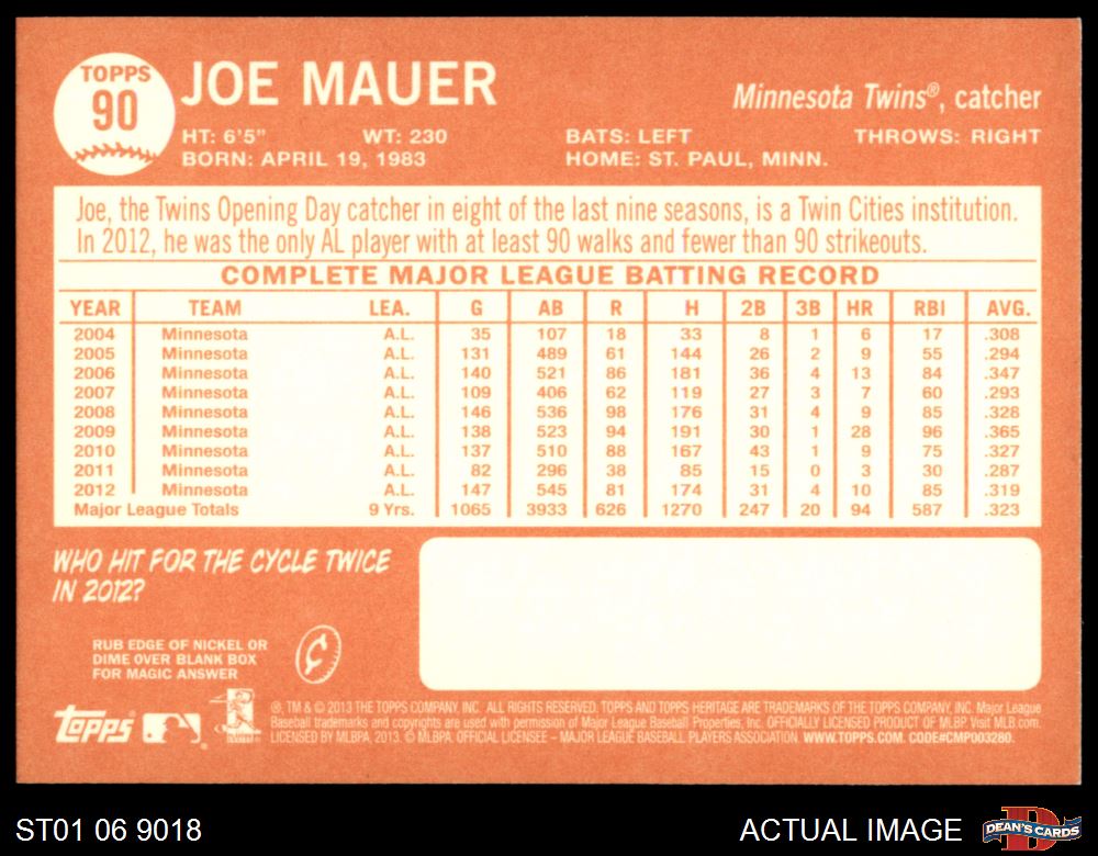 2013 Topps Heritage #90 A Joe Mauer 8 - NM/MT
