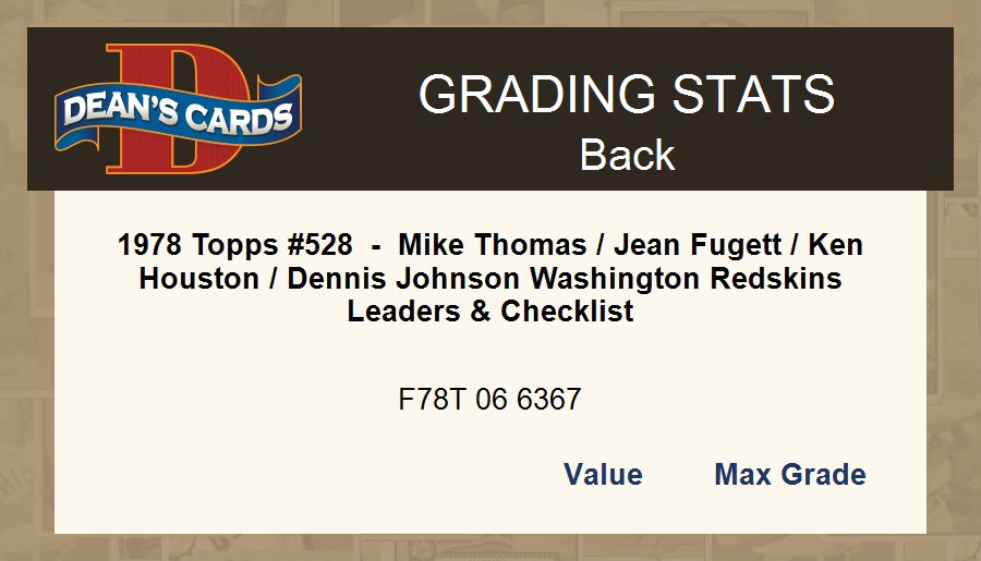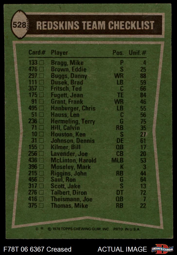 1978 Topps #528 - Mike Thomas / Jean Fugett / Ken Houston / Dennis Johnson Washington Redskins Leaders & Checklist 2.5 - GD+