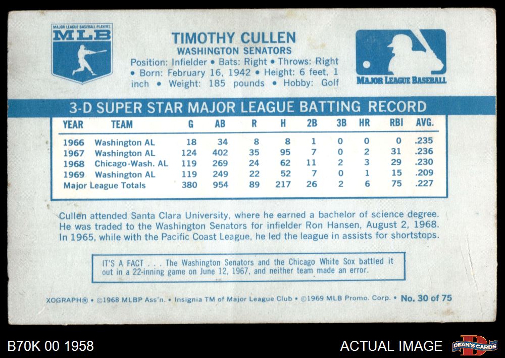 1970 Kellogg's #30 Tim Cullen 2 - GOOD
