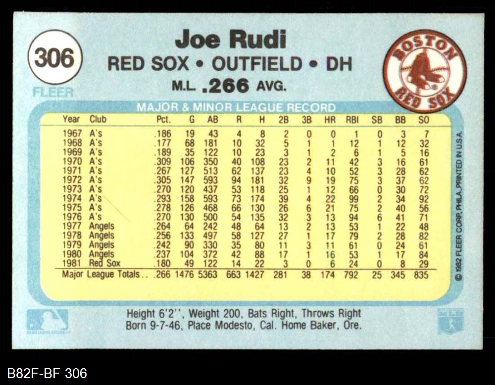 1982 Fleer #306 Joe Rudi 8 - NM/MT