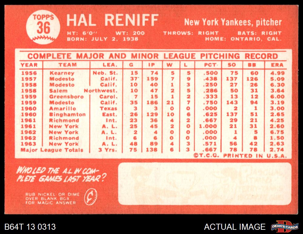1964 Topps #36 Hal Reniff 5 - EX