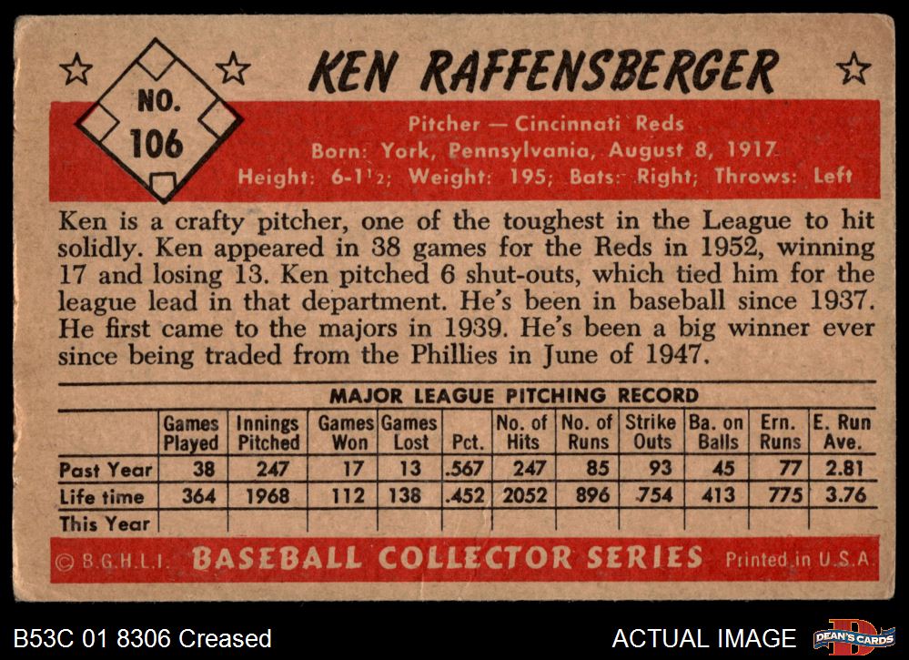 1953 Bowman #106 Ken Raffensberger 2 - GOOD