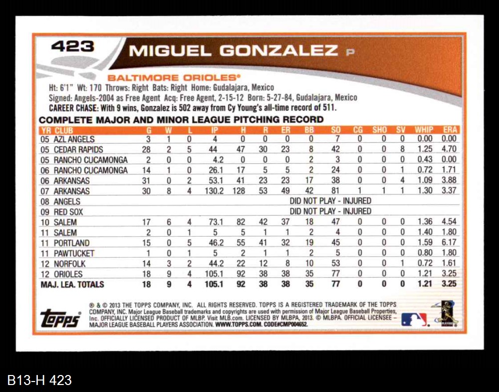 2013 Topps #423 Miguel Gonzalez