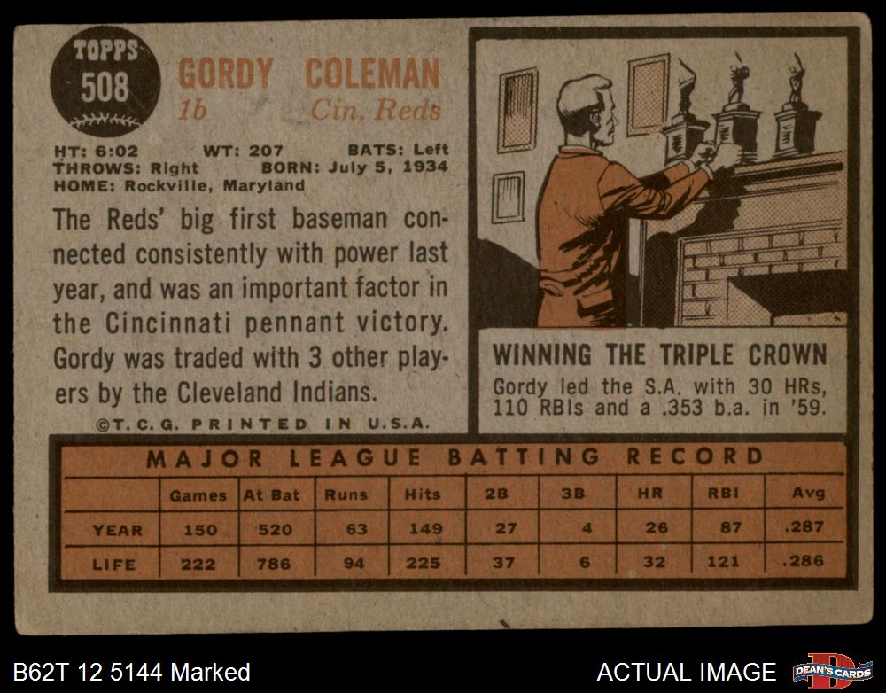 1962 Topps #508 Gordy Coleman Front Thumbnail
