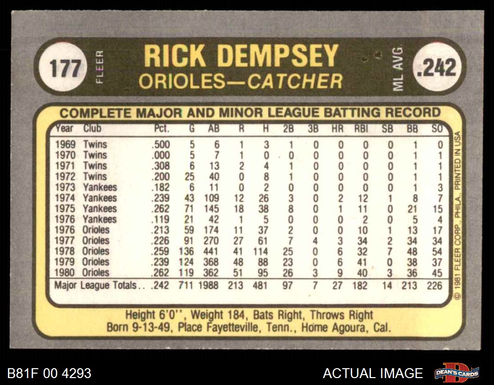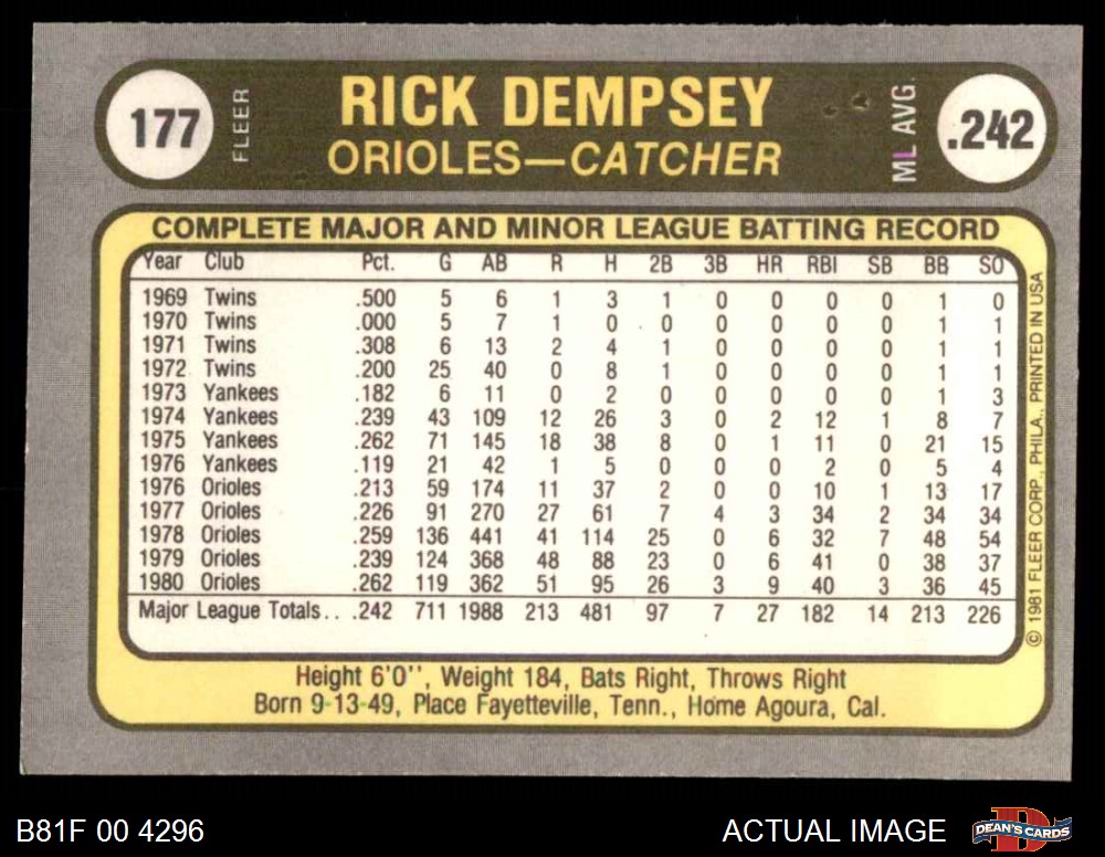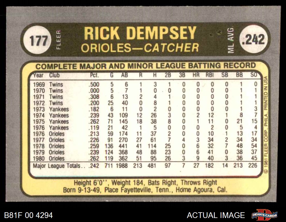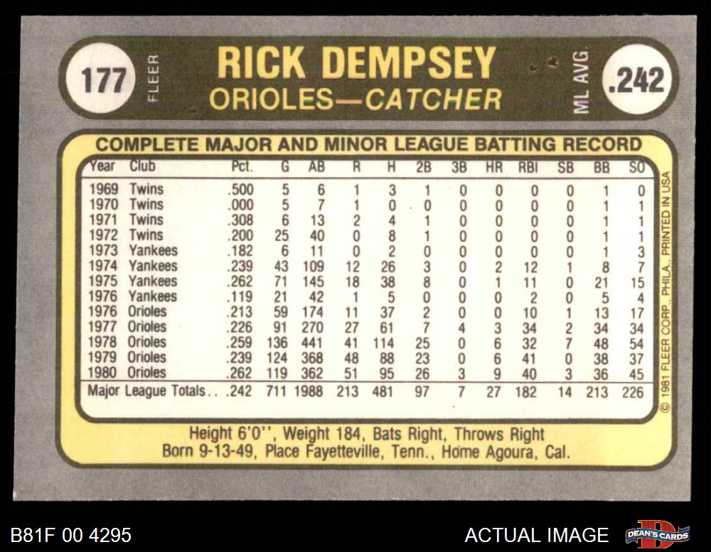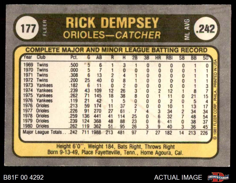1981 Fleer #177 xHAND Rick Dempsey 5 - EX
