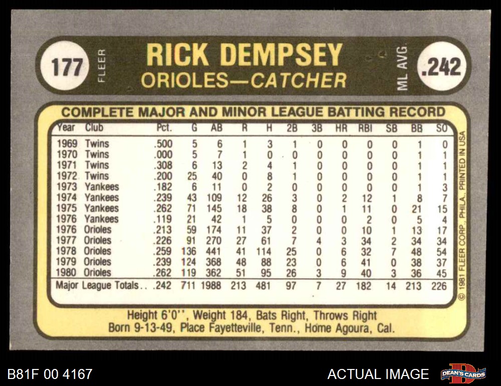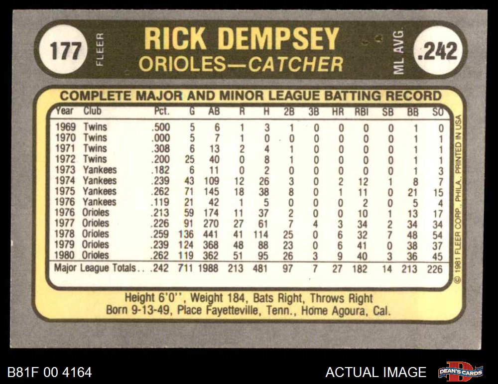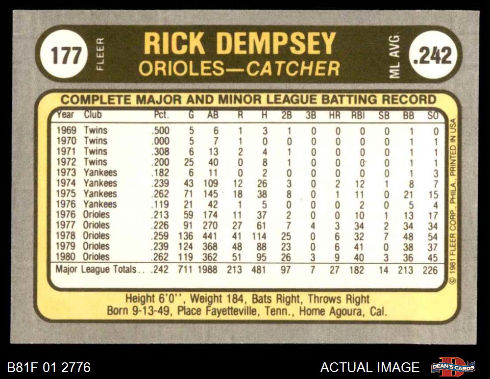 1981 Fleer #177 xHAND Rick Dempsey 6 - EX/MT