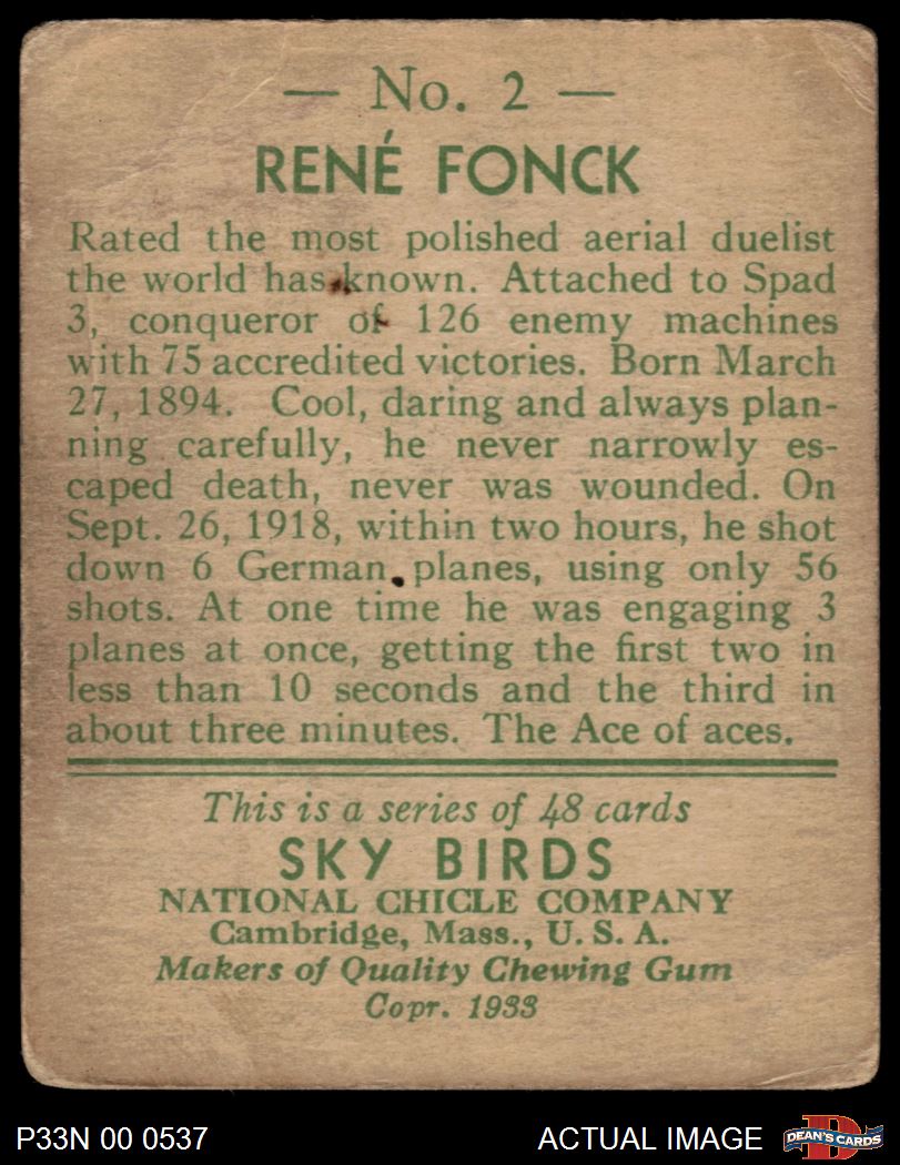 1933 National Chicle Sky Birds #2 Rene Fonck 1.5 - FAIR
