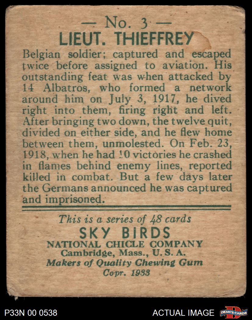 1933 National Chicle Sky Birds #3 Lieut Thieffry 1.5 - FAIR