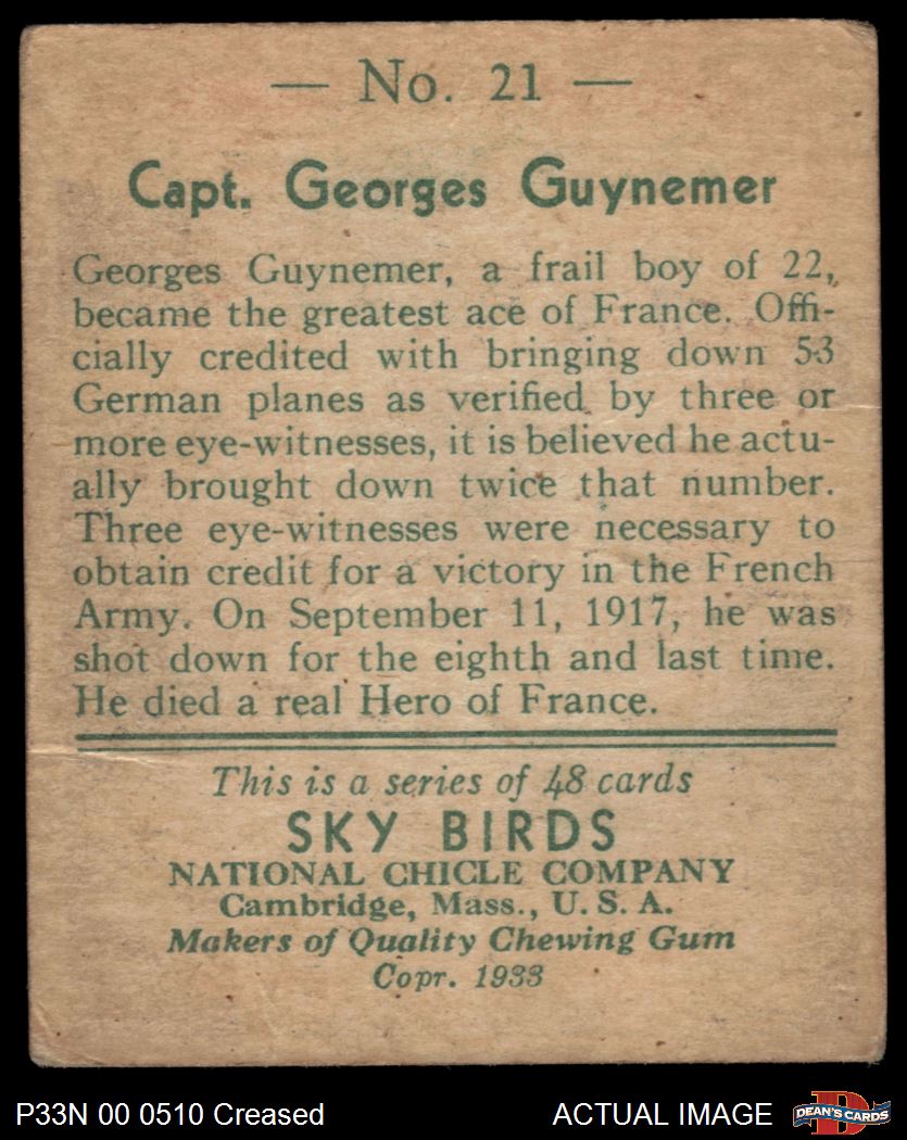 1933 National Chicle Sky Birds #21 Georges Guynemer 2 - GOOD