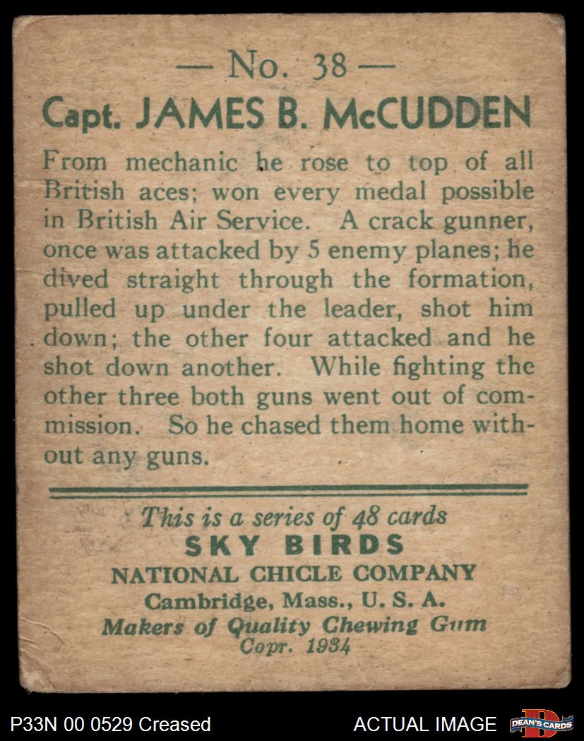 1934 National Chicle Sky Birds #38 Can read series of 48 or 144 cards on Back James McCudden 2 - GOOD